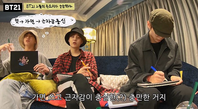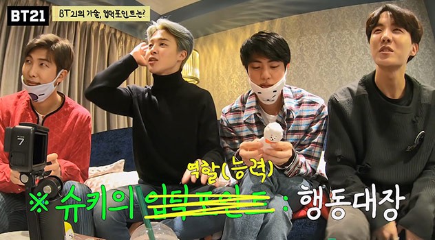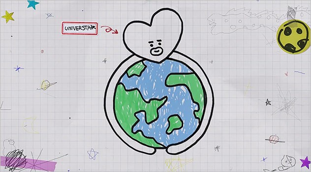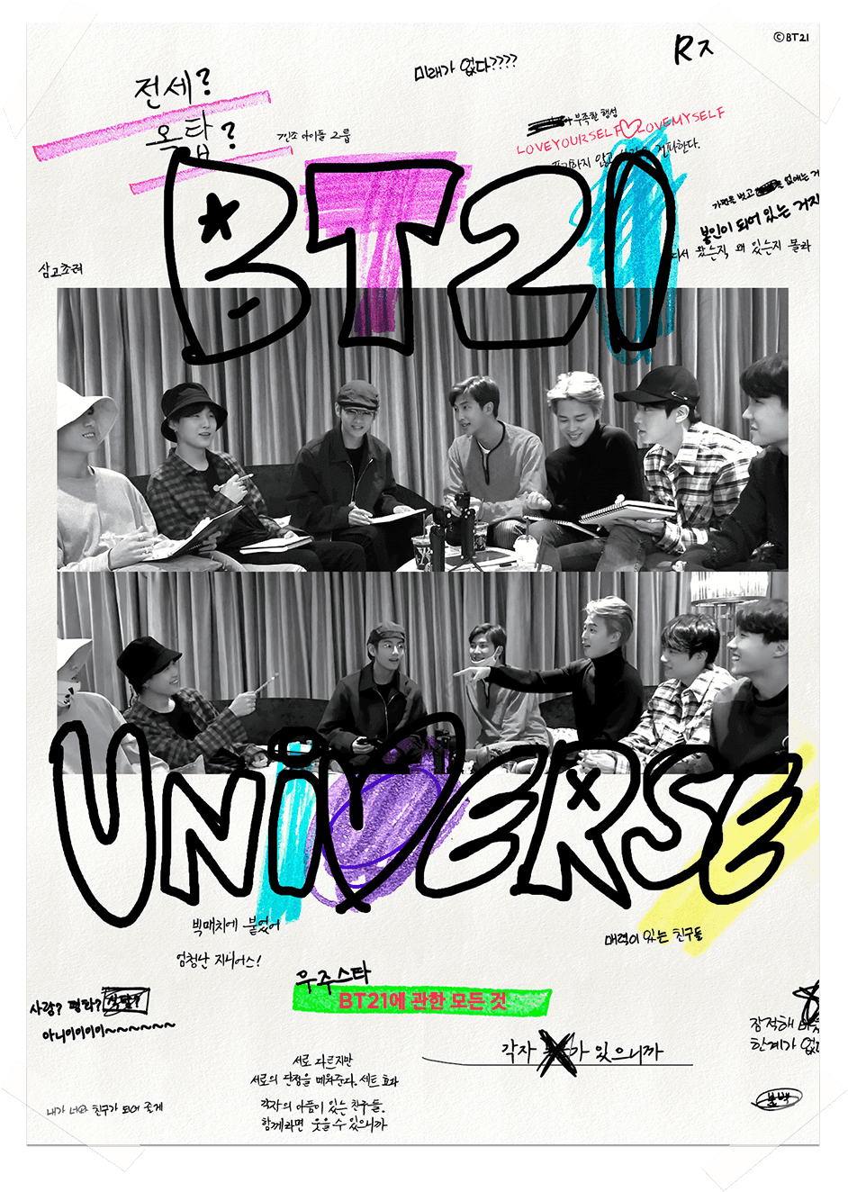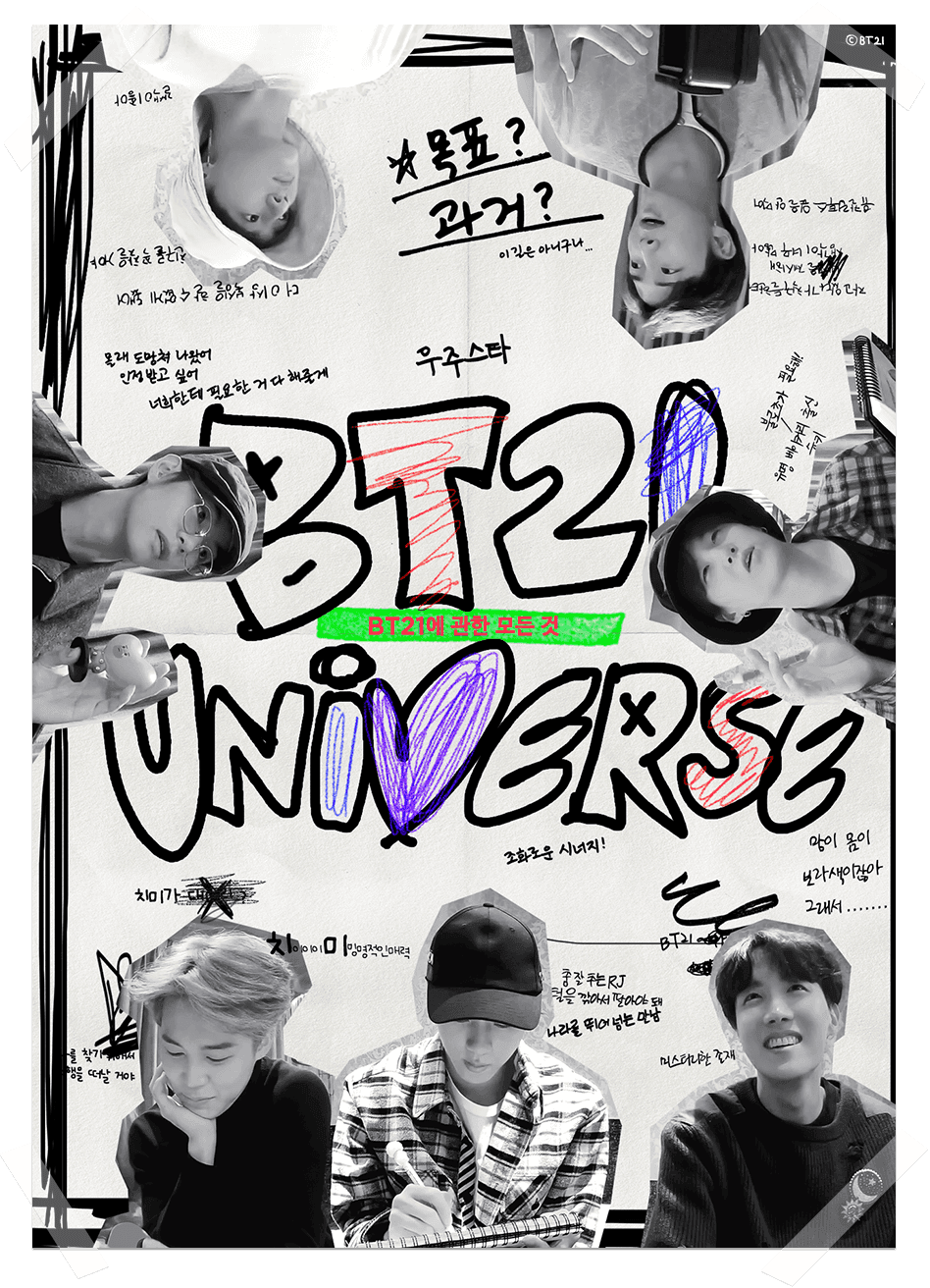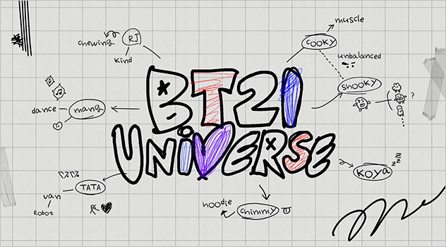 BT21 UNIVERSE 시즌 2에서는 BTS가 BT21 캐릭터들의 친구, 라이벌, 가족을 설정하고, BT21의 과거 이야기를 논의하는 과정을 담았습니다. BTS는 자유롭고 편안한 분위기 속에서 둘러앉아 흥미로운 아이디어를 자연스럽게 주고받았으며, 각자의 생각을 노트에 러프하게 적고 공유하며 열띤 토론을 펼쳤습니다. 이러한 생생한 분위기를 콘텐츠 디자인에 그대로 녹여내기 위해 노트에 아무렇게나 끄적인 글씨와 낙서 스타일의 요소를 포스터, 타이틀, 자막 등 다양한 그래픽 디자인에 활용했습니다. 또한, BTS 멤버들이 실제로 작성한 노트의 느낌을 그대로 살려 더욱 몰입감을 높이고자 했습니다.