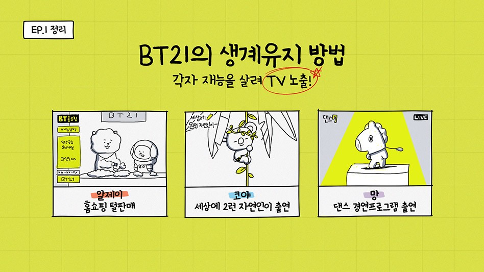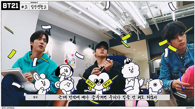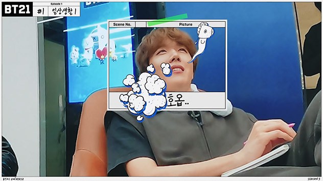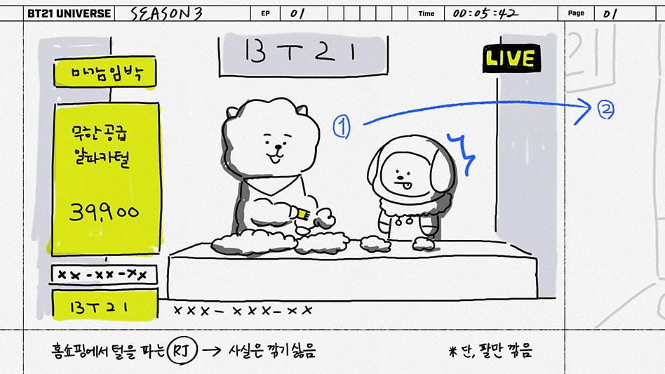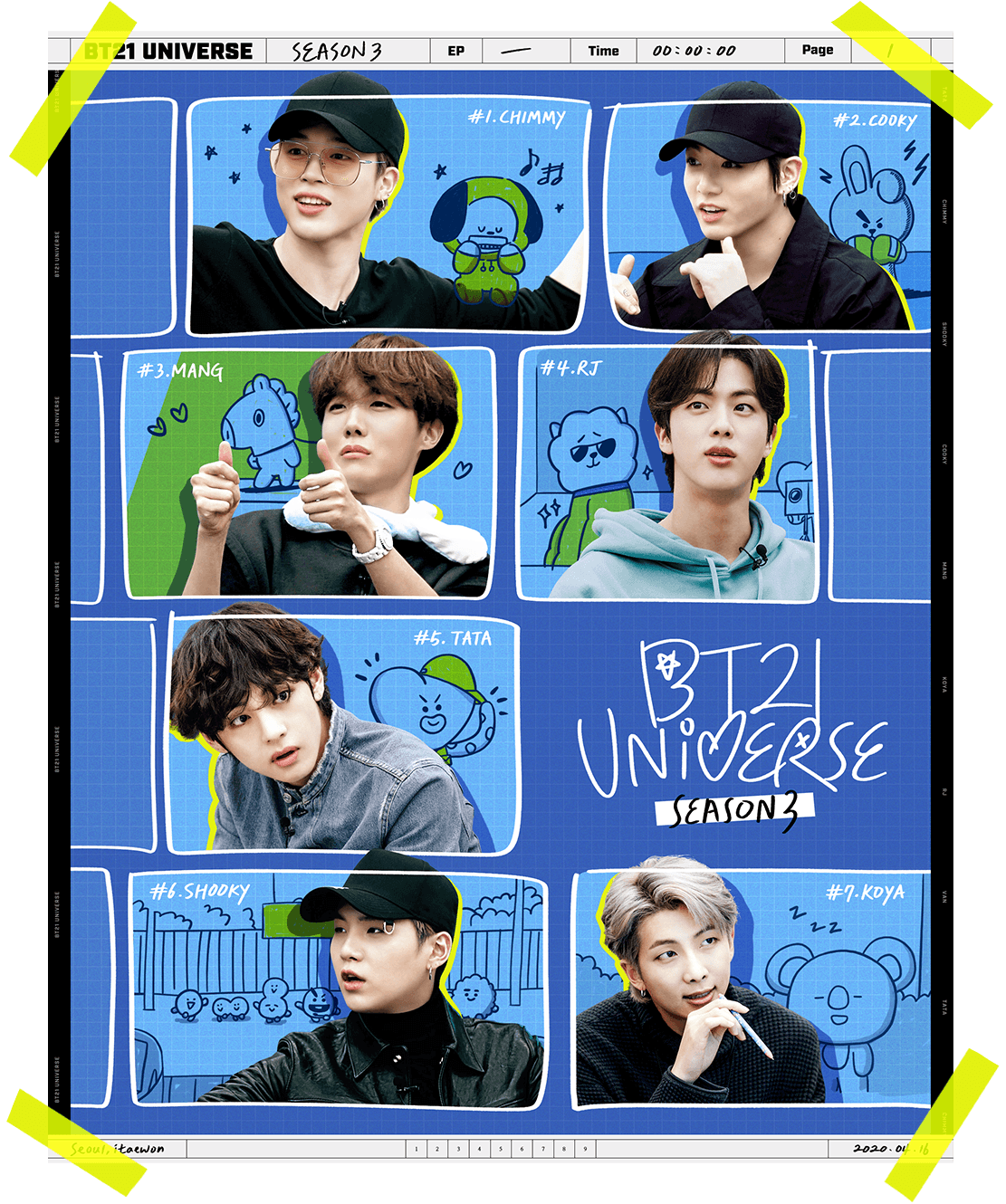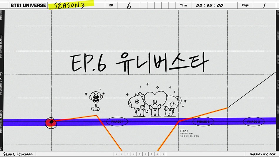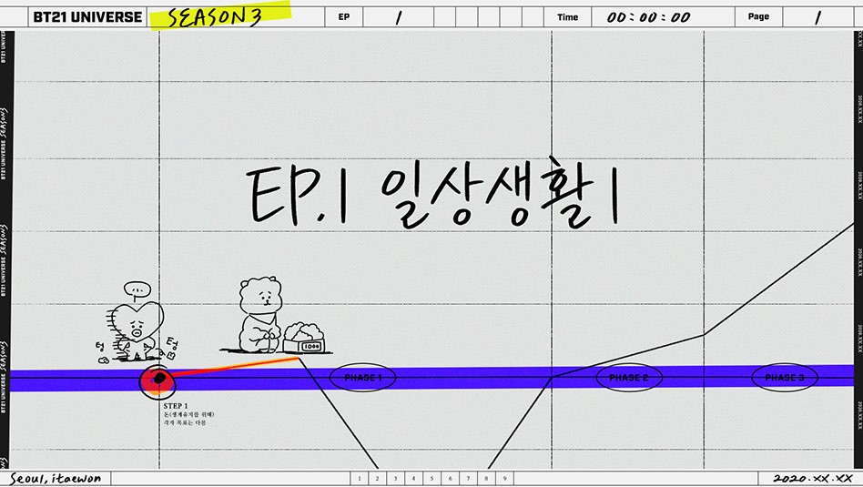 BT21 UNIVERSE 시즌 3에서는 BTS가 각자의 상상력을 발휘해 BT21의 새로운 세계관과 스토리를 토론하는 과정을 담았습니다. 이번 시즌은 메이킹 영상 1편을 먼저 공개한 뒤, 해당 영상에서 다룬 에피소드를 쇼츠 애니메이션으로 제작해 매주 순차적으로 선보이는 방식으로 진행되었습니다. 메이킹 영상과 애니메이션 간의 연결성을 더욱 강화하고 메이킹 영상 자체가 애니메이션의 스토리보드 역할을 한다는 점을 강조하기 위해 스토리보드 양식을 메이킹 영상 디자인의 콘셉트로 설정했습니다. 또한 스토리보드 프레임을 활용해 BTS 멤버들이 직접 그린 BT21의 인생 그래프와 시즌 2보다 더욱 구체적이고 다양한 논의 과정을 효과적으로 정리하여 전달하고자 했습니다.