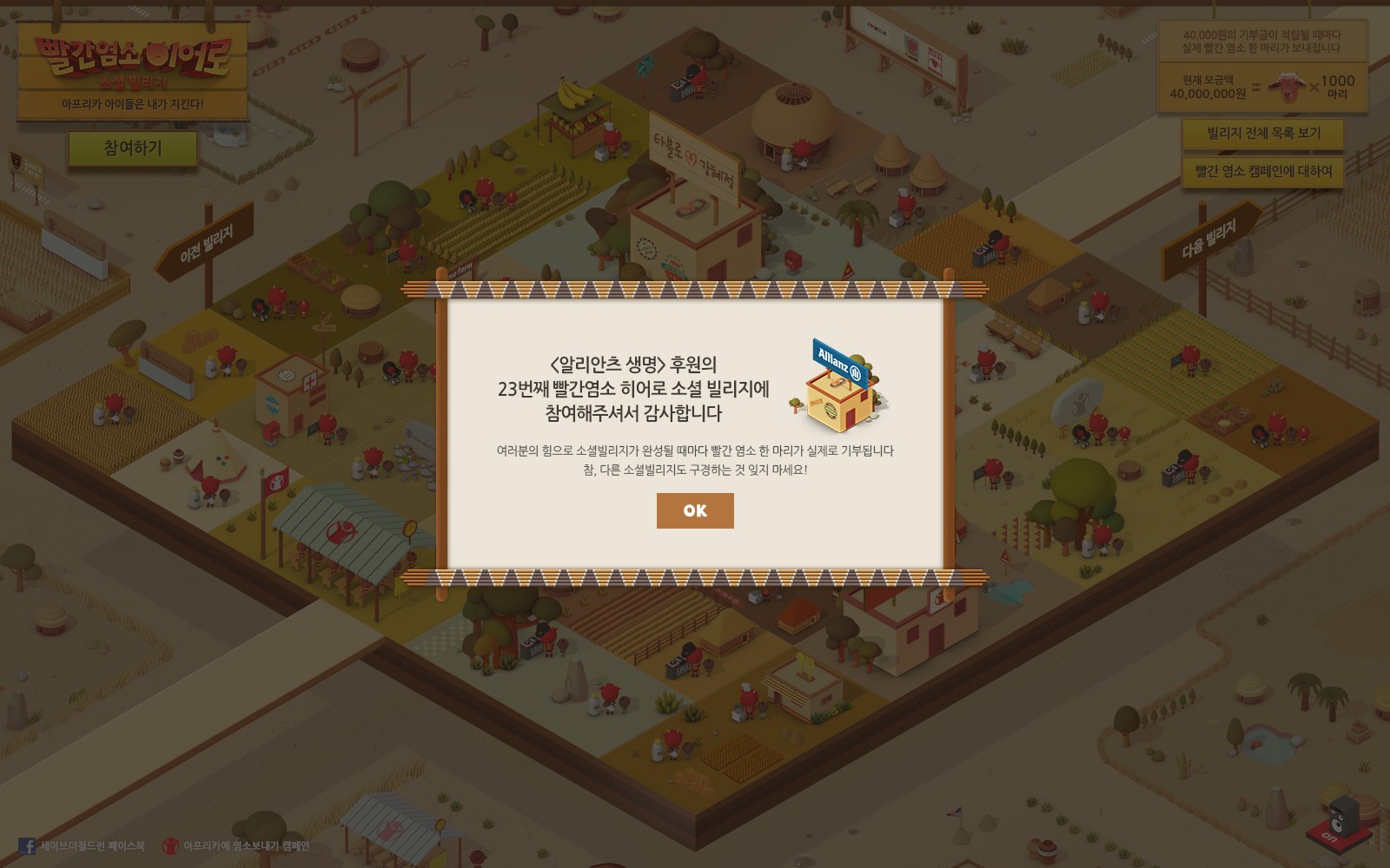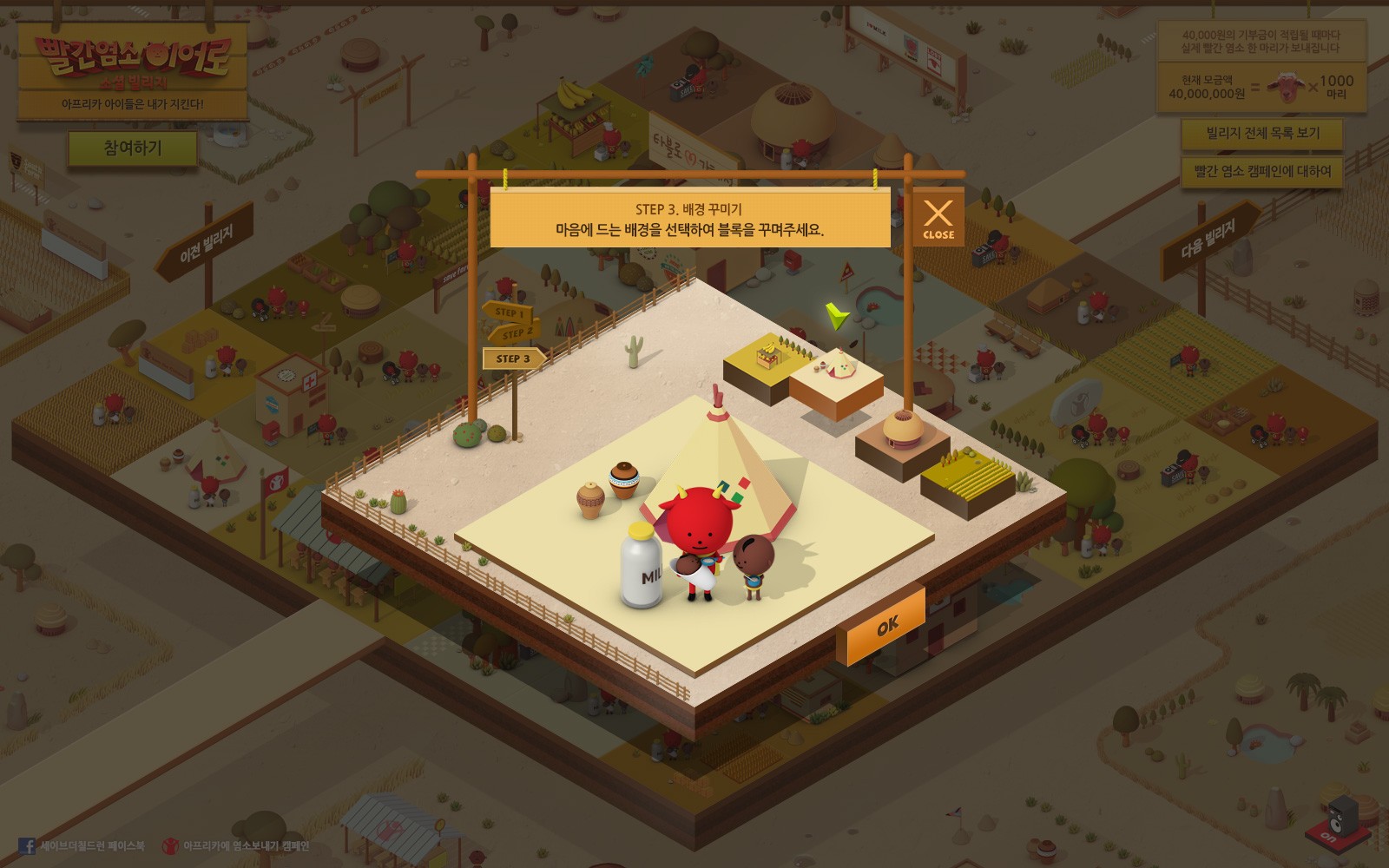 40명의 참여자가 모여 하나의 빌리지를 완성하면 빌리지 당 1마리의 염소가 브랜드들의 후원으로 아프리카에 기부되는 형태입니다. (1인 참여 = 1000원 기부 효과)