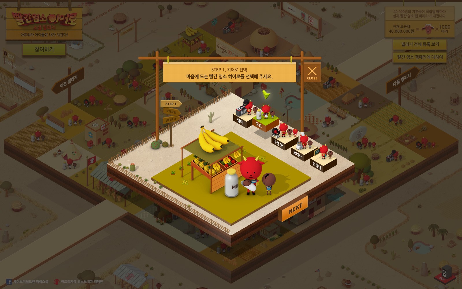 사용자는 다섯 역할의 염소 히어로 중 하나를 선택해 소셜 빌리지의 일원으로 실제 아프리카에 빨간 염소를 보내는 기부를 경험할 수 있습니다.