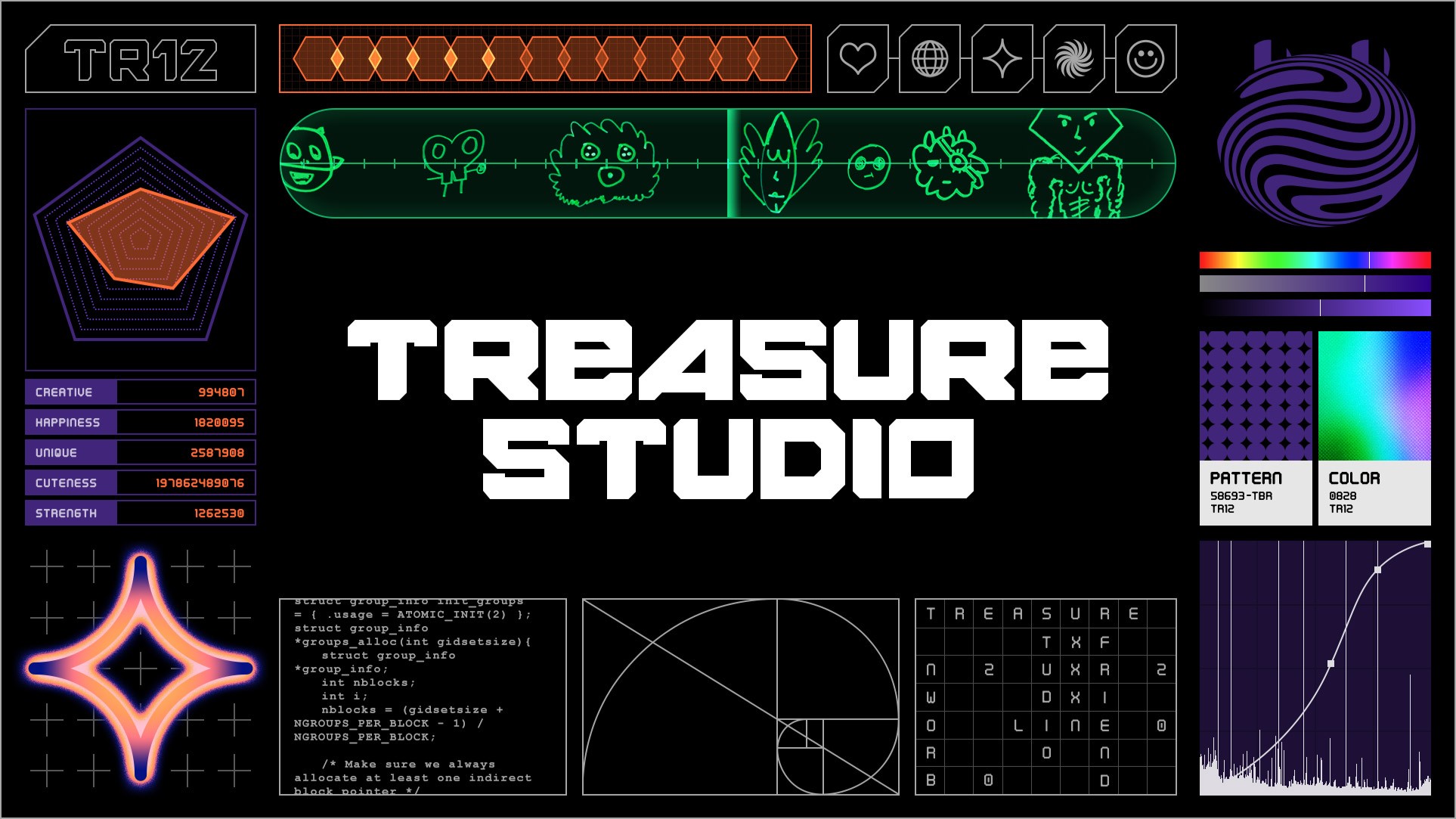 라인프렌즈는 YG 보이그룹 트레저와 함께 미션을 수행하며 캐릭터를 만들고 성장시키는 콘텐츠를 제작했습니다. 트레저 스튜디오는 트레저가 미션을 수행하며 멤버별 DNA를 비과학적으로 분석하고 육감을 기반으로 데이터를 수집해 분신을 창조하는 연구를 진행하는 공간으로 설정했습니다. 트레저 멤버들이 트레저 스튜디오에서 각자의 개성과 엉뚱하고 톡톡 튀는 아이디어로 퀘스트(미션)를 통과하고 크레딧(보상)을 받아 캐릭터를 탄생시키고 키우는 게임적 과정을 시각화하여 타이틀과 콘텐츠 디자인 전반에 반영했습니다.